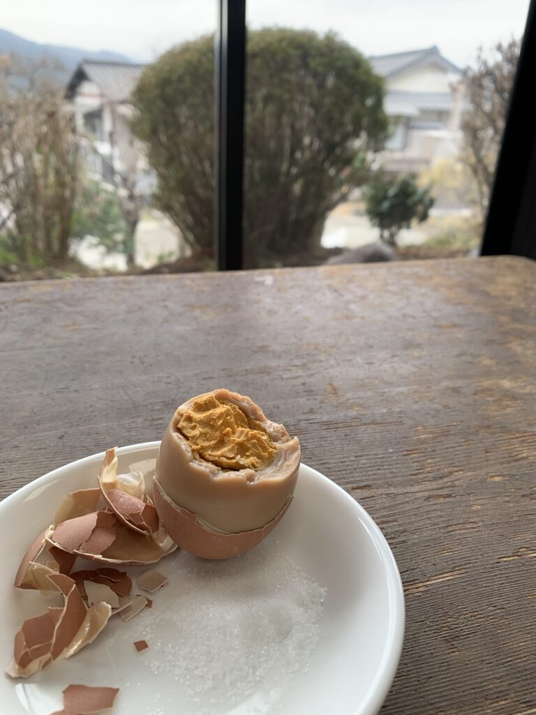 豊後汁はお団子を伸ばしたようなうどんのようなものが入っていて、そこに柚子胡椒をたっぷり入れていただきます!
