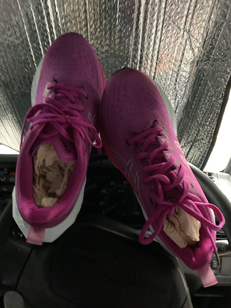 車に着いた私は買ったばかりのアシックスにティッシュをつめつめ、うちわで仰ぎながら乾かしました。